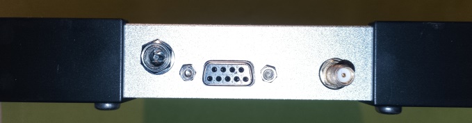 Gp2017TR Transmitter: Von links nach rechts: Spannungsversorgung gängige DC Buchse, RS232 Buchse, Antennenanschluss SMA-Female.
