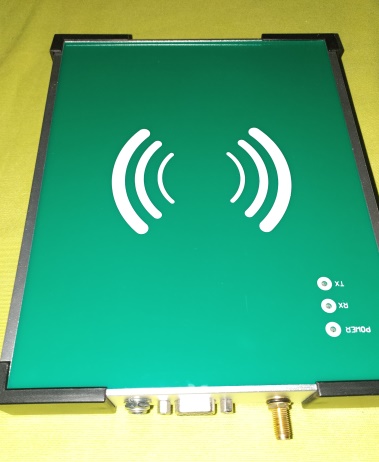 Der "Transmitter" in grünem Gehäuse, kleine Mini-Antenne mit SMA-Male, das Kabel für die serielle Schnittstelle, ein Netzteil mit europäischem Stecker waren mit dabei.